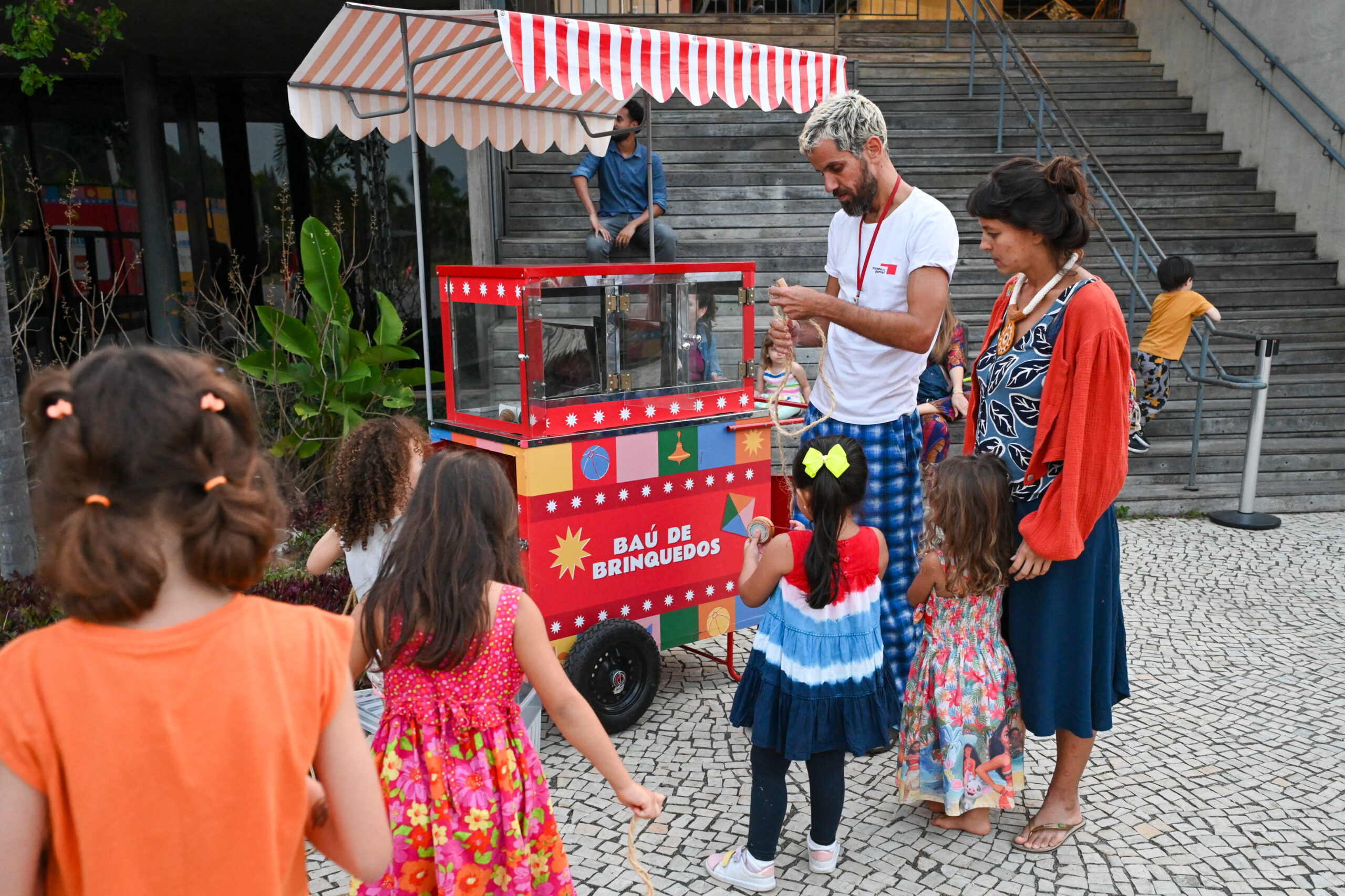 Um baú com brinquedos populares, como ioiôs, bilboquês, petecas, piões, fantoches, elásticos, cordas para pular, giz para amarelinha e bambolês, é aberto pelos arte-educadores todos os fins de semana, no jardim do museu.